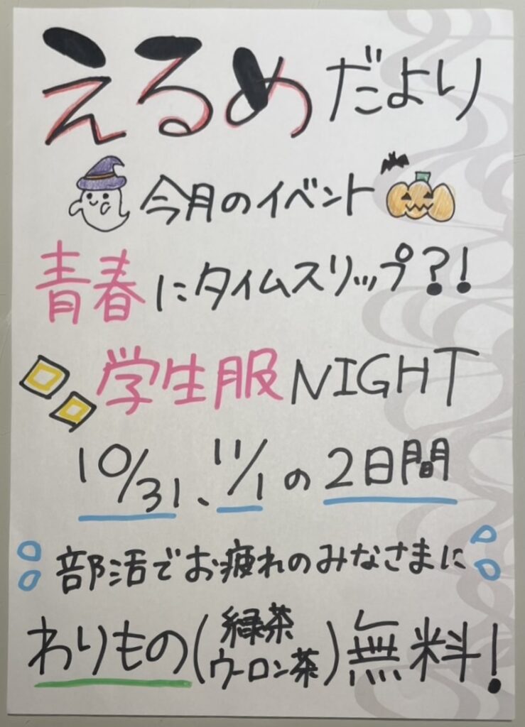 スナックElme -ハロウィンイベント- 2025-10-03 最終更新日時 : 2025-10-12 user スナックElme青春にタイムスリップ?!学生服NIGHT【期間】10/31(金)・11/1(土)
